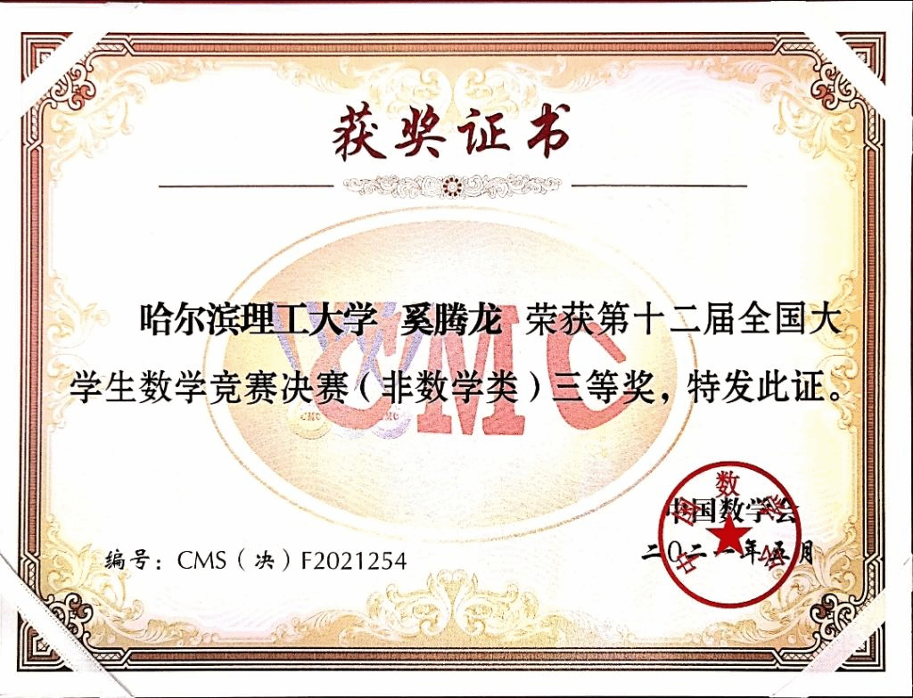 第十二届全国大学生数学竞赛决赛于5月15日在吉林大学举行,此次决赛分为数学类高年级组、数学类低年级组和非数学类三个组别进行。本次竞赛的初赛共有32个赛区206921人报名参加,经过选拔共有来自清华大学、北京大学等207所高校的646人参加决赛,其中数学专业组343人,非数学专业组303人。我校信息与计算科学专业的张鸿鹏、车辆工程专业奚腾龙代表黑龙江赛区参赛,均荣获了全国决赛三等奖的好成绩。
