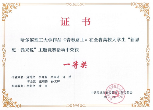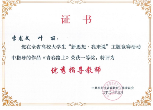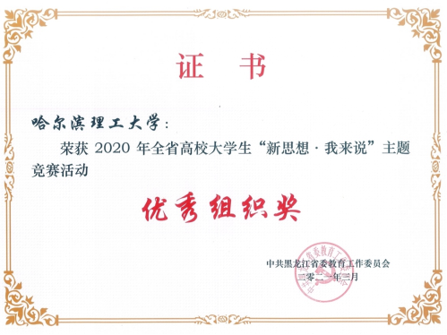 为深入推进习近平新时代中国特色社会主义思想进教材进课堂进头脑,坚持不懈坚持用习近平新时代中国特色社会主义思想铸魂育人,深入实施新时代学校思想政治理论课改革创新先行试点专项工作,省教育工委开展了全省高校大学生“新思想·我来说”主题竞赛活动,我校高度重视此项活动,党委学生工作部与马克思主义学院共同制定方案、发布通知、广泛宣传动员、精心组织申报,我校推荐的作品获得一等奖一项、三等奖一项、李龙文、叶丽两位教师荣获“优秀指导教师”称号,我校获得“优秀组织奖”称号。