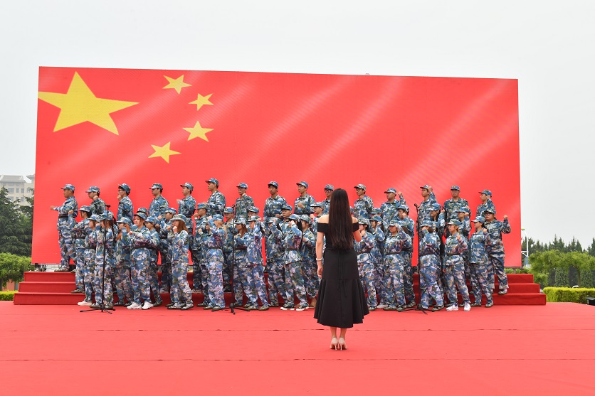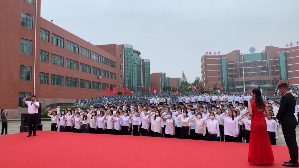 会前,学生代表组成方阵,通过千余人互动性拉歌方式颂国情感党恩,用歌声传递对党对祖国的美好祝福。