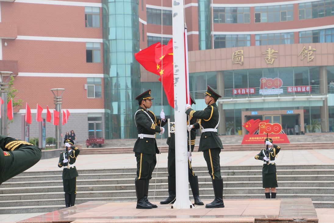 我心向党,忠诚爱国。学院大学生国旗护卫队踏着坚定的步伐,高擎旗帜列队正步走向旗台,举行升国旗、唱国歌仪式。伴随着庄严的旋律,在场全体师生行举手礼和注目礼,共同表达对党和国家的敬爱之情。