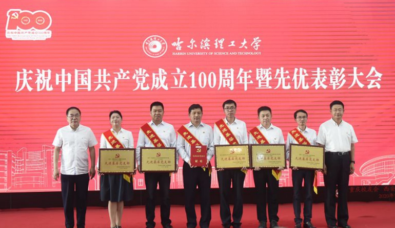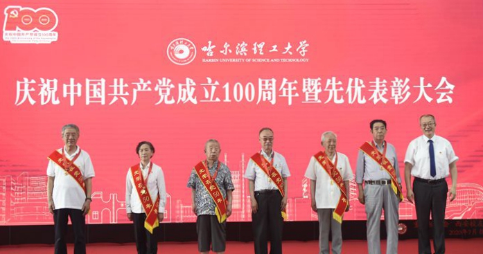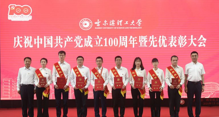 首先由陆岩副书记宣读获奖名单。胡军同志获黑龙江省“优秀共产党员”荣誉称号,陈明华、张凤鸣、武建龙、李东洁、邹芸潞5位同志获省委教育工委“优秀共产党员”荣誉称号,李新灵、艾荻、乔林3位同志获省委教育工委“优秀党务工作者”荣誉称号,材料科学与化学工程学院金属材料工程系党支部、电气与电子工程学院电气绝缘与电缆党支部、机械动力工程学院机械工程实验中心党支部获省委教育工委“先进基层党组织”荣誉称号。陆岩宣读《哈尔滨理工大学2019-2021年度“两优一先”表彰的决定》,对吴石等56名优秀共产党员、戴湘竹等6名优秀党务工作者、机械设计及其自动化系党支部等6个党组织 “先进基层党组织”进行表彰,学校党委书记、校长赵琳及全体校领导为受表彰代表颁奖,同时为老党员代表颁发“光荣在党50年”纪念章,全场响起一阵阵热烈的掌声。
