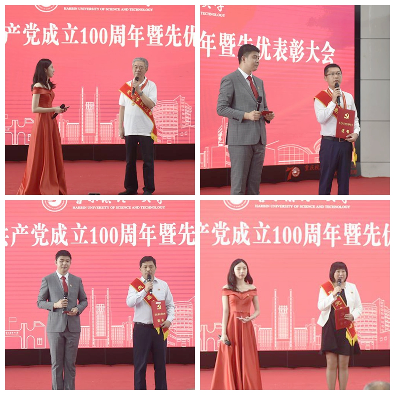 在颁奖访谈环节,几位教师代表表达了他们激动的心情和为学校继续奉献智慧力量的决心。“我是教师,也是党员,我为这两个身份而感到自豪,我愿意把我的青春献给母校、献给党,尽全力完成好这光荣的育人使命。”全省优秀共产党员获得者胡军在发言中表示,在未来的工作中,会继续攀登科学高峰,不断激发自己的潜能,做好教书育人工作,为学校的“双一流”建设做出自己的贡献。优秀党务工作者代表戴湘竹结合自己19年党务工作的心得体会,表示基层党组织是党密切联系群众最重要的桥梁和纽带。要做好基层党建工作,首先要突出服务师生这个重点。只有把服务师生、方便师生、造福师生作为学院党建工作的出发点和落脚点,才能让党员群众时时触摸到党建的脉搏、感受到党建的温度。也只有通过做深入人心的工作,厚植党的执政基础,才能使党建达到润物无声的效果。省委教育工委先进基层党组织获奖单位代表迟庆国表示,绝缘与电缆系党支部拥有教师党员14人,是一支老、中、青年相结合的队伍。每一名党员同志都以高度负责的态度做知识的传播者,坚守教育工作者立德树人的初心和使命。“我是1966年大学毕业前夕入党的,到现在已经55年的党龄了,入党时的情景仍记忆犹新。值此中国共产党建党100周年之际,希望我们的国家更强大,我们的人民更幸福,希望我们的学校早日腾飞。” “光荣在党50年”老党员代表、哈尔滨理工大学原副校长、本科教学总督学郭建英祝福中国共产党百年华诞。