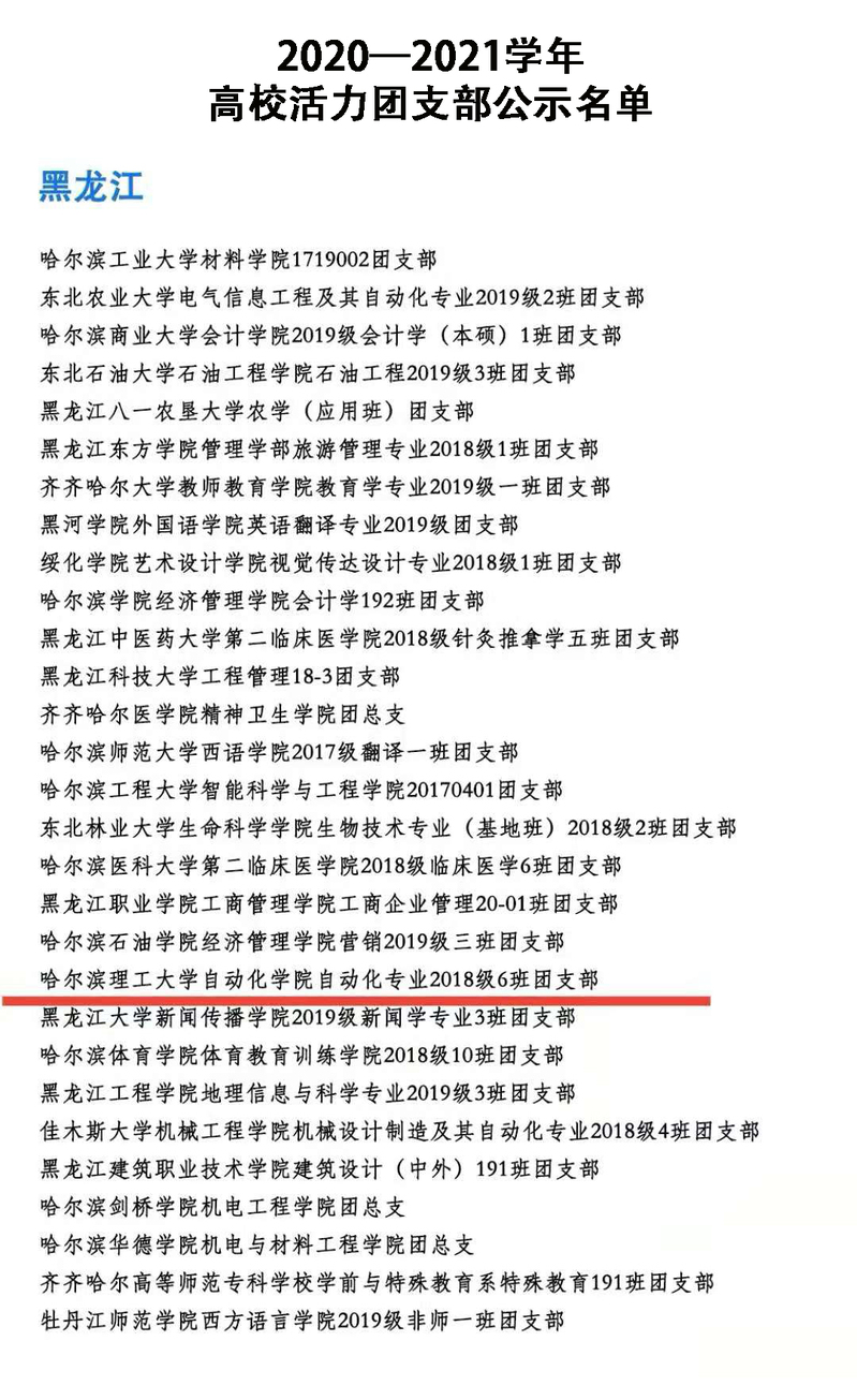 此次入选全国“活力团支部”创建遴选活动的团支部是我校基层团支部的优秀代表,自动化学院自动化专业2018级6班团支部是一个充满活力,团结友爱、自强自信的集体,有着规范的团支部制度,浓厚的学术氛围,形式多样、内容丰富的支部活动,一年来,支部自发组织开展活动40余次,班级同学积极参与志愿服务,累计共参与100多人次,共服务4500多人,支部先后有52人次获各类奖学金,支部成员积极参与各类社会实践、志愿公益、学术竞赛和校园文体活动,多人荣获电子竞赛和数学竞赛省级奖项。支部荣获黑龙江省“青年大学习”网上主题团课组织工作“先进集体”、校“先进团支部”、校“五四红旗团支部”等荣誉称号。