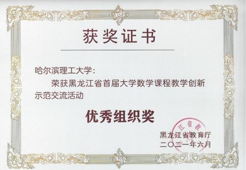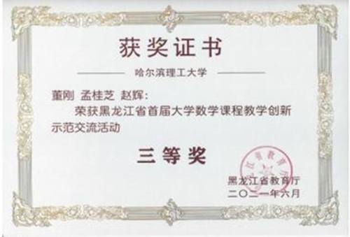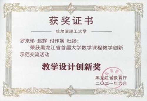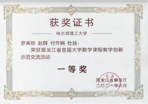 罗来珍(主讲教师)、赵辉、付作娴、杜杨团队主讲《概率论与数理统计》课程获得了教授组一等奖第一名,并获得教学设计创新奖;李莎莎(主讲教师)、赵辉、王树忠、孟桂芝团队主讲《高等数学》课程获得了讲师组一等奖第一名;董刚(主讲教师)、孟桂芝、赵辉团队主讲《高等数学》课程获得了讲师组三等奖。教师罗来珍和李莎莎将代表黑龙江省参加“首届全国高校大学数学课程教学创新示范交流活动”。