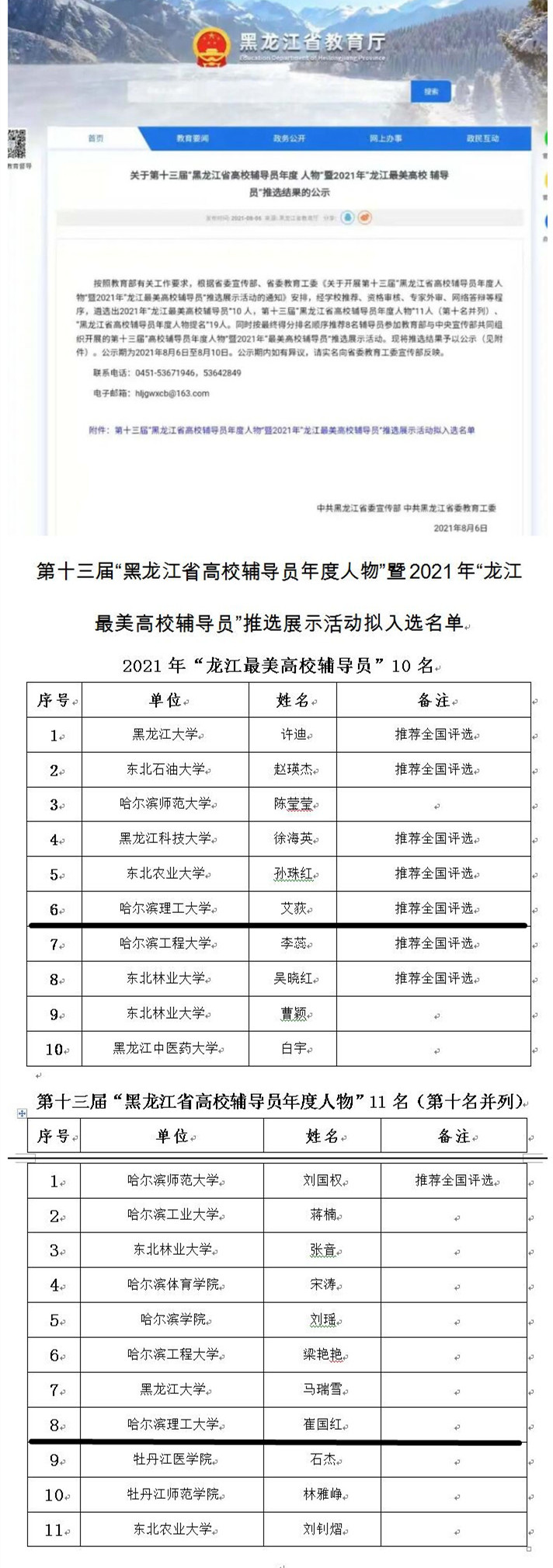 近日,由黑龙江省委宣传部、省委教育工委主办的第十三届“黑龙江省高校辅导员年度人物”暨2021年“龙江最美高校辅导员”评选活动结果揭晓,我校自动化学院党委副书记艾荻获得2021年“龙江最美高校辅导员”荣誉称号,并作为黑龙江省辅导员代表参加教育部与中央宣传部共同组织的第十三届“全国高校辅导员年度人物”暨2021年“最美高校辅导员”评选活动;机械动力工程学院辅导员崔国红获得第十三届“黑龙江省高校辅导员年度人物”荣誉称号。这是我校辅导员首次被推荐参加全国“最美高校辅导员”评比,是我校在辅导员队伍建设和发展过程中取得的又一重要成果。