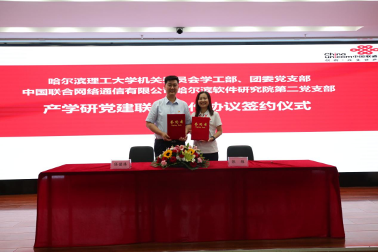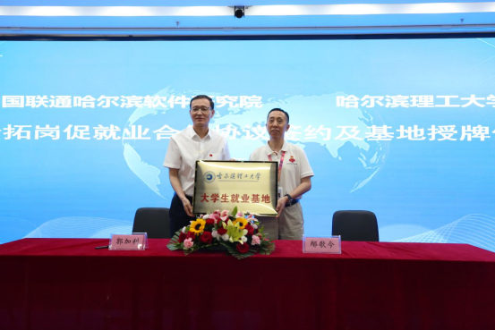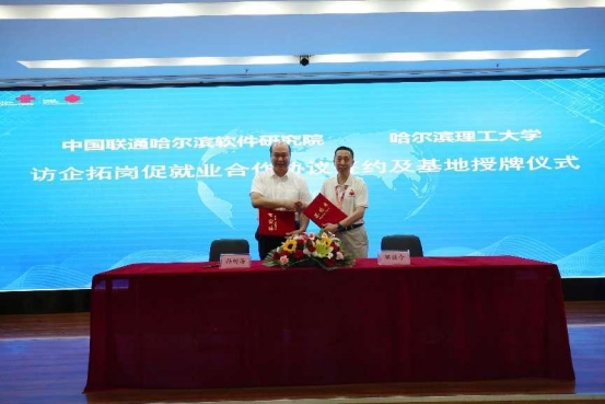 座谈会后的签约仪式上,学校党委副书记郭加利为中国联通哈尔滨软件研究院授予哈尔滨理工大学“大学生就业基地”的牌匾。纪委书记孙树海代表学校与联通哈尔滨软件研究院签订《校企共建就业实习基地协议书》。学校党委学生工作部副部长任佳伟与联通哈尔滨软件研究院人力资源部经理张维作为双方单位的基层党支部书记共同签署了产学研党支部共建协议。