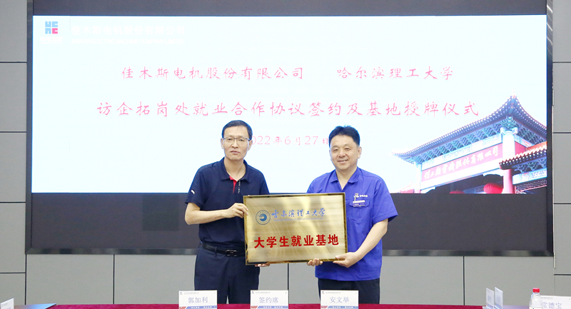 学校与佳木斯电机股份有限公司签署了《大学生就业基地协议书》和《产学研党建联盟协议书》,并进行授牌