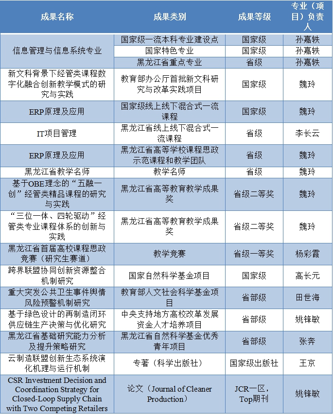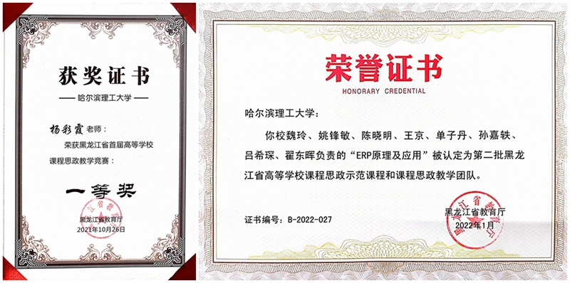 今年年初,黑龙江省教育厅公布第二批黑龙江省高等学校课程思政示范项目名单,我校经济与管理学院信息管理与信息系统系申报的“ERP原理及应用”课程思政示范课程和教学团队被认定为黑龙江省高等学校课程思政示范课程和教学团队;信管系专业骨干教师主持及参与完成的教研项目分别获评2020、2022年“黑龙江省高等教育教学成果”一等奖、二等奖各2项,一流本科专业建设再创新佳绩。