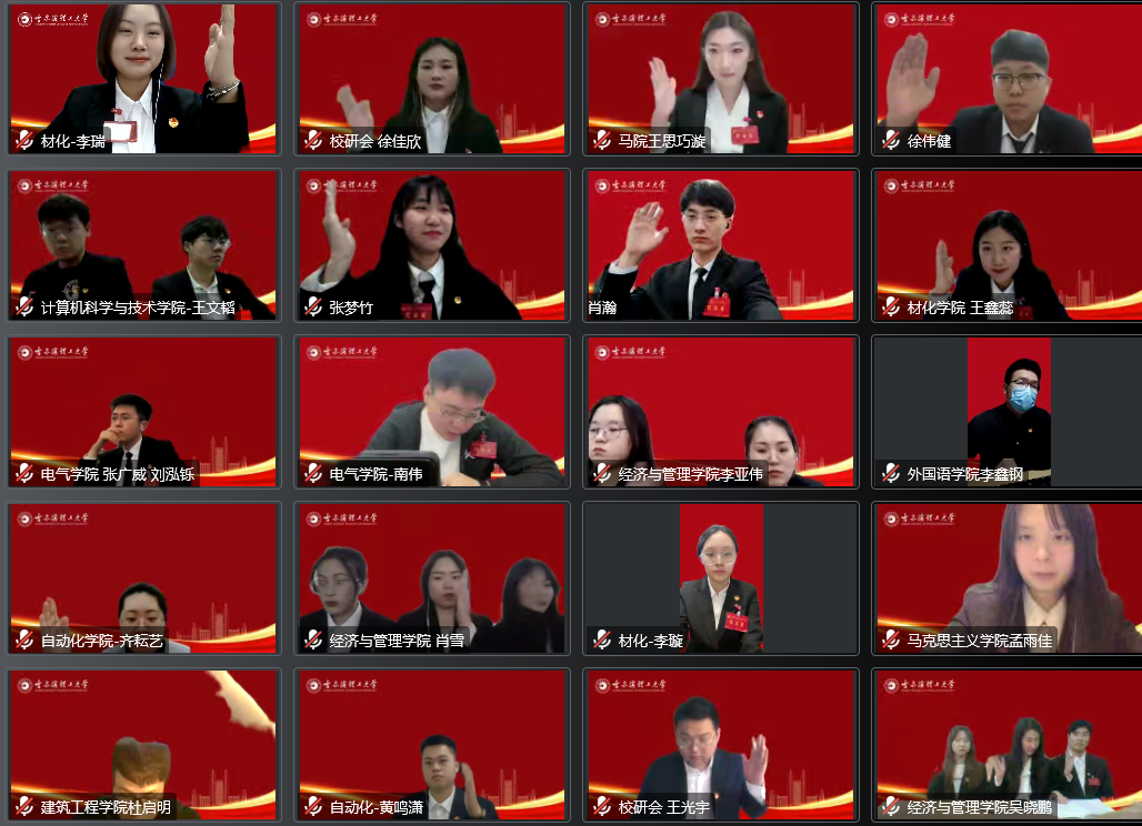 11月20日上午9时,在雄壮的国歌声中,哈尔滨理工大学第三次学生代表大会暨第三次研究生代表大会在线上开幕。黑龙江省驻会主席黄亚南、哈尔滨工程大学学生会主席王浩屹、校团委副书记曹石、校团委组织建设部负责人张奇、各学院团委书记,各学院学生会、研究生会指导教师列席会议。开幕式由校学生会指导教师李晟睿主持,526名代表表肩负着广大青年学生的重托,担负着青春梦、强校梦、中国梦的青春使命与担当,满怀着憧憬、喜悦与激动出席大会,青春相聚,回顾过往,共话未来。