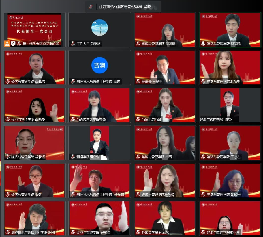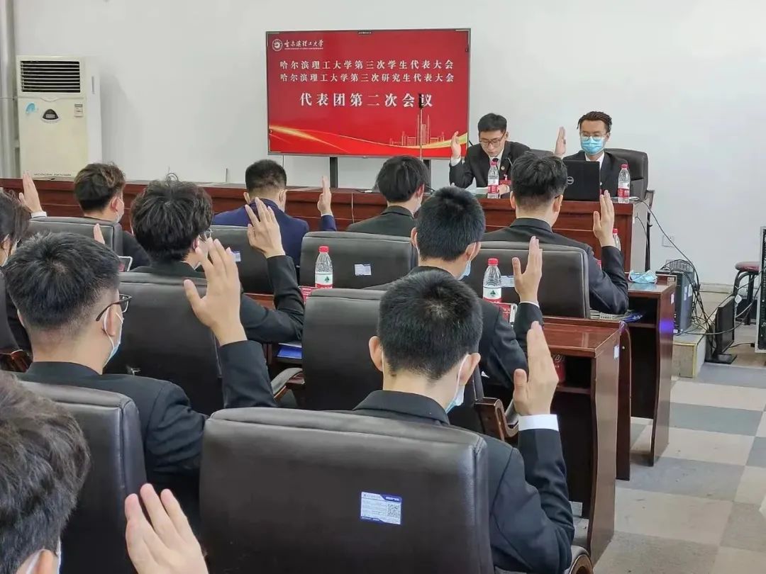 开幕式结束后,第三次学生代表大会和第三次研究生代表大会分别继续召开,韩陆同学代表哈尔滨理工大学第二届学生会作工作报告;王光宇同学代表哈尔滨理工大学第二届研究生会作工作报告;随后,12个学生代表团和11个研究生代表团分别进入网络会议室进行了分组讨论并对校领导的讲话与党的二十大精神进行了学习,各代表团代表踊跃发言,各抒己见,热议学代会、研代会报告。分组讨论结束后,召开了大会主席团会议,并进行了大会选举。全体代表按照既定议程和大会选举办法,经过民主投票,选举产生了哈尔滨理工大学第三届学生会主席团成员和第三届研究生会主席团成员。
