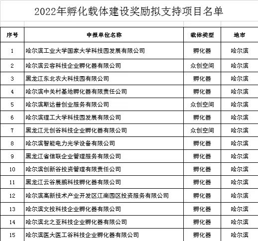 根据《黑龙江省科学技术厅黑龙江省财政厅关于印发黑龙江省科技类产业政策实施细则》(黑政办规〔2022〕3号)及《黑龙江省科学技术厅关于组织申报2022年孵化载体建设奖励的通知》,由我校科技园申报,省科技厅组织专家评审“黑龙江省2022年度孵化载体建设奖励项目”,我校科技园成功获批最高额度100万元,此项目为《新时代龙江人才振兴60条》项目,充分体现了有关部门对我校科技园作为优秀孵化载体培育企业高质量发展的肯定。