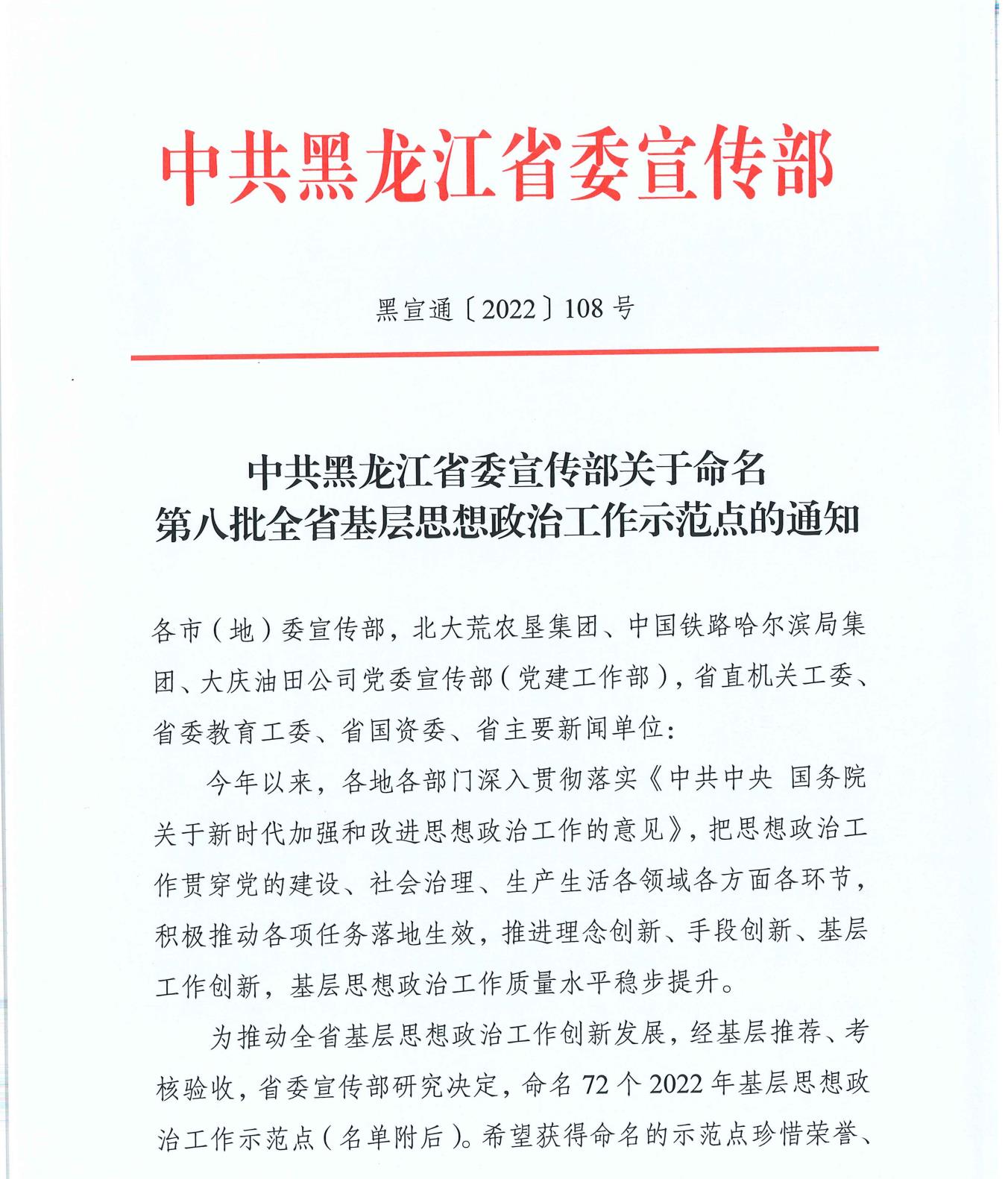近年来,学校党委高度重视思想政治工作,坚持用习近平新时代中国特色社会主义思想凝心铸魂,认真落实立德树人根本任务,遵循思想政治工作规律,思想政治工作质量和水平不断提升,此次被命名为基层思想政治工作示范点,是我校连续第二批次获此示范点建设项目,也是学校持续加强思想政治工作取得的重要成果。接下来,学校将深入学习贯彻党的二十大精神,紧紧围绕立德树人根本任务,完善思想政治工作体系,充分发挥示范点示范导向和辐射带动作用,切实提高基层思想政治工作科学化规范化制度化水平,进一步加强和改进学校思想政治工作,为龙江振兴发展和学校高质量内涵式发展提供有力思想保障和强大精神力量。