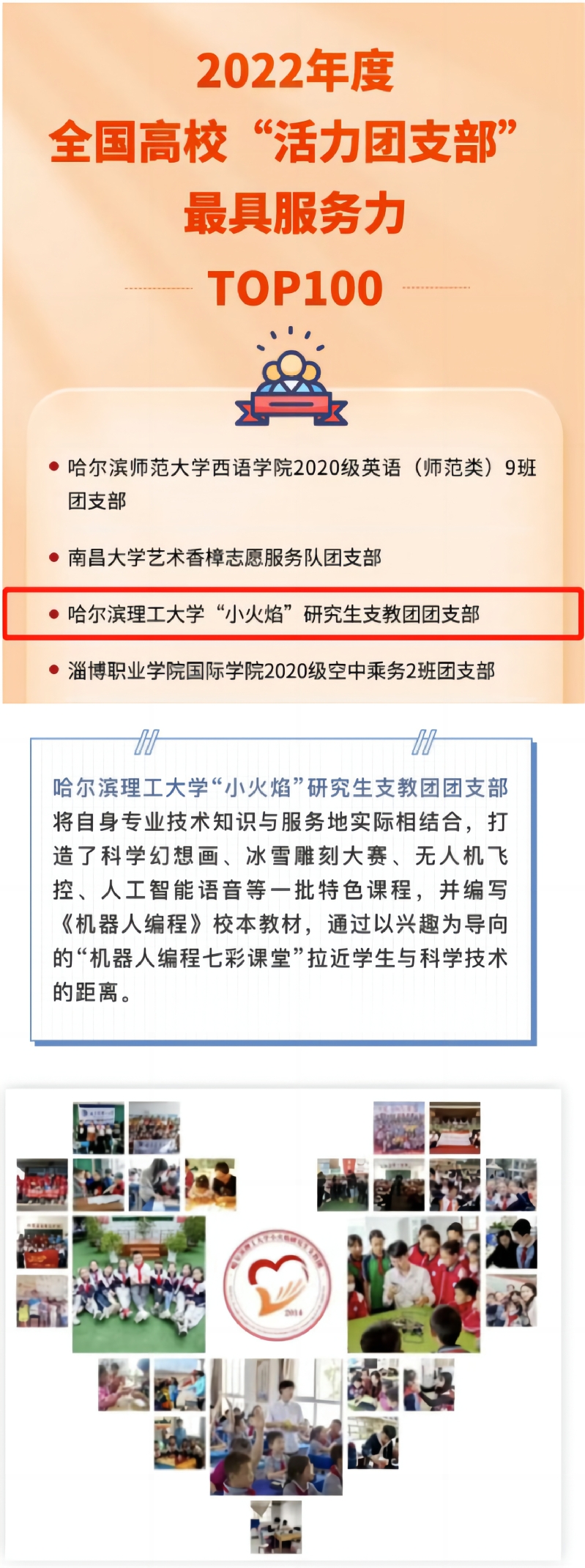 近日,由团中央基层建设部指导中国青年报社开展的2022年度高校“活力团支部”风采展示活动评选结果揭晓,经过校内遴选、校级展示、省级展示、全国展示等环节,我校“小火焰”研究生支教团团支部入选2022年度全国高校“活力团支部”最具服务力TOP10榜,并被中国青年报专题报道;自动化学院机器人工程2019级2班团支部入选2022年度全国高校“活力团支部”最具引领力TOP100榜。