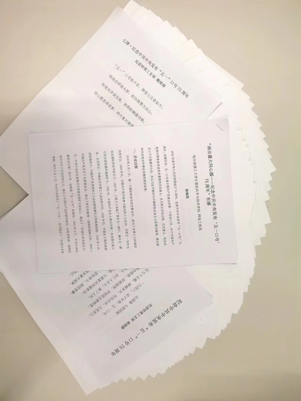 4月18日-5月8日期间,党委统战部组织开展了“画出最大同心圆——纪念中共中央发布‘五一口号’75周年”主题征文活动,征文形式为诗歌、散文等多种题材。活动得到了统战成员的积极响应,大家踊跃投稿,结合自身工作,结合龙江和学校的发展规划,畅叙展望,抒发爱党爱国情怀,展现了民主党派等统一战线各界人士的时代风采和良好精神风貌,党委统战部对评选出的优秀作品进行了选送推荐。