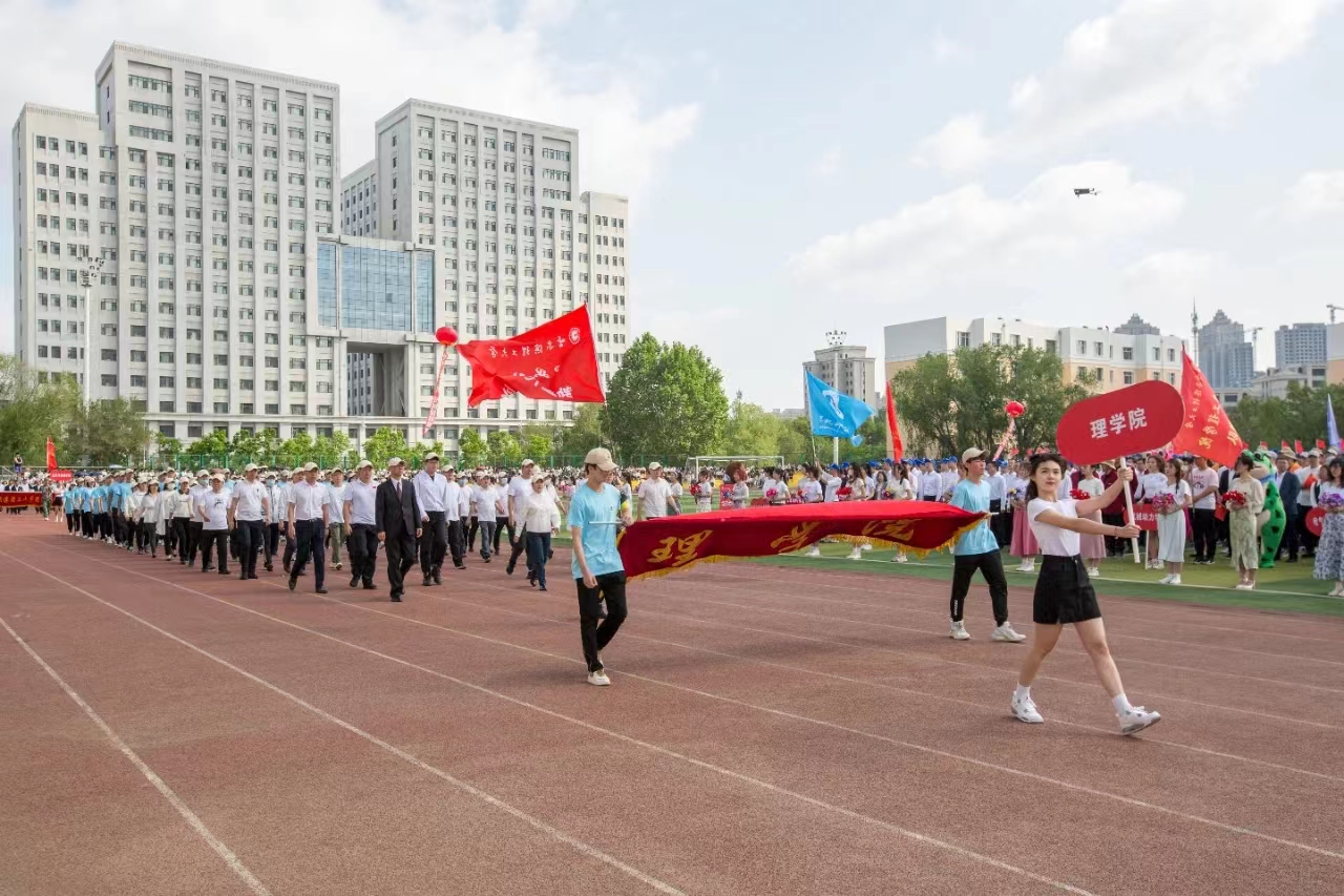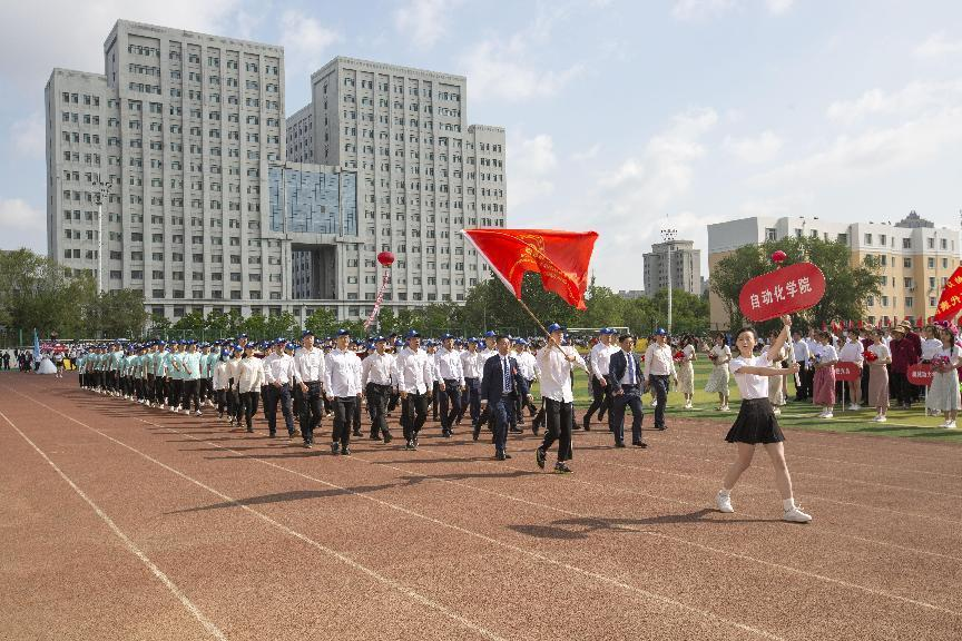 伴着初夏的暖阳,各单位方阵依次通过主席台接受检阅,运动员们昂首阔步、精神饱满、斗志昂扬、英姿飒爽、口号嘹亮,在前期精心的准备过程中以“步履铿锵,强体魄之魂;赛场驰骋,耀时代之光”的理念和“更快、更高、更强——更团结”的奥林匹克精神作为踔厉奋发、笃行不怠的内在动力,展现了理工师生顽强拼搏、奋发进取、永不言弃、超越自我的精神风貌。主席台和观众席向运动健儿们报以热烈的掌声。国旗护卫队目光如炬,步履铿锵,走在检阅队伍的最前方,庄严护送国旗入场。裁判员、运动员、各单位方阵入场后,举行了升国旗、奏国歌、鸣礼炮和升校旗、奏校歌仪式。