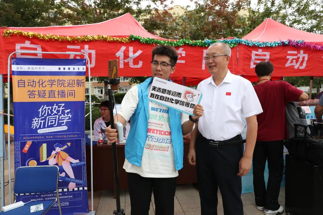 学校领导与迎新志愿者在现场交流