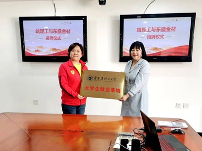 戴湘竹与哈尔滨东盛金属材料有限公司副总经理王海英举行了“哈尔滨理工大学大学生就业基地”授牌仪式。