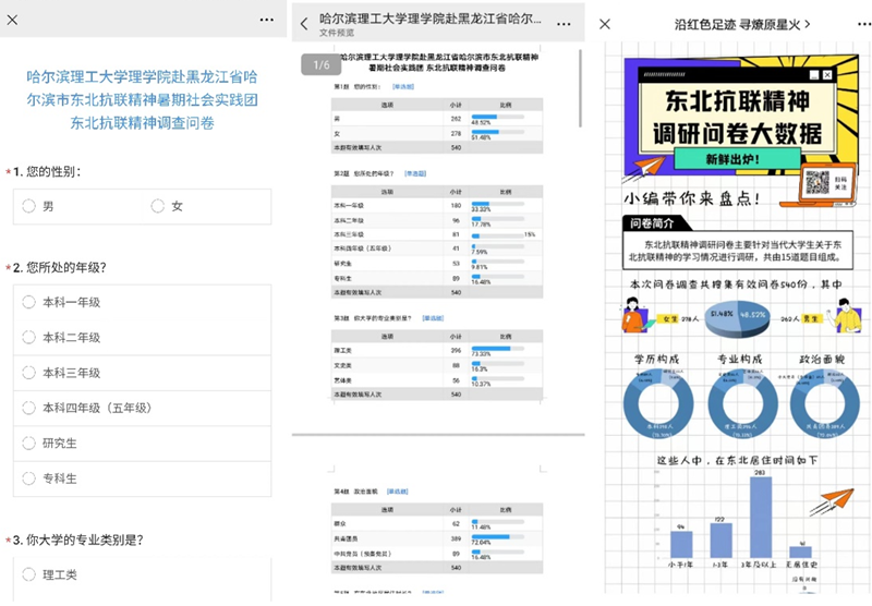 在一个月的实践征程中,团队将调研采访成果进行整理汇总,面向村镇、企业、社区、学校等基层单位开展宣讲共12场,累计参会人数达2000余人。团队建立“沿红色足迹 寻燎原星火”微信公众号作为宣传阵地,累计发表推文25篇,发布实践记录视频10部,浏览量达5000余次。团队产出的社会实践调研报告,获评教育部中国大学生在线网站“‘大我青春’2022暑期社会实践成果征集展示活动调查报告类优秀作品”和“第十八届工商银行‘挑战杯’黑龙江省大学生课外学术科技作品竞赛二等奖”。