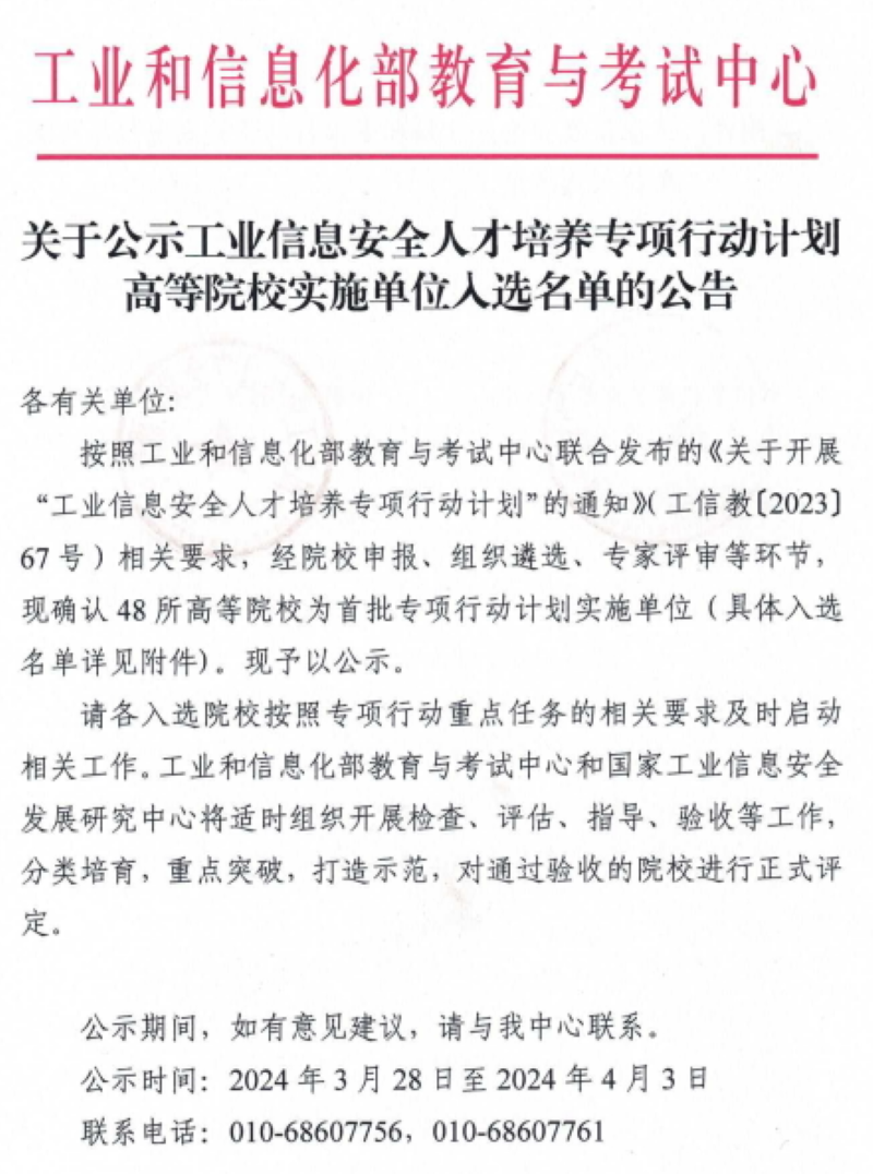 为深入贯彻落实党中央国务院关于促进网络安全产业发展、深化产教融合等决策部署,在学校领导和教务处指导下,2023年12月计算机科学与技术学院(软件学院、网络空间安全学院)组织专业负责人和骨干教师申报了工信部《工业信息安全人才培养专项行动计划》,经过组织遴选、分组答辩、专家评审等环节,我校与浙江大学、华中科技大学、东南大学等48所高校成功入选首批专项行动计划高等院校实施单位。