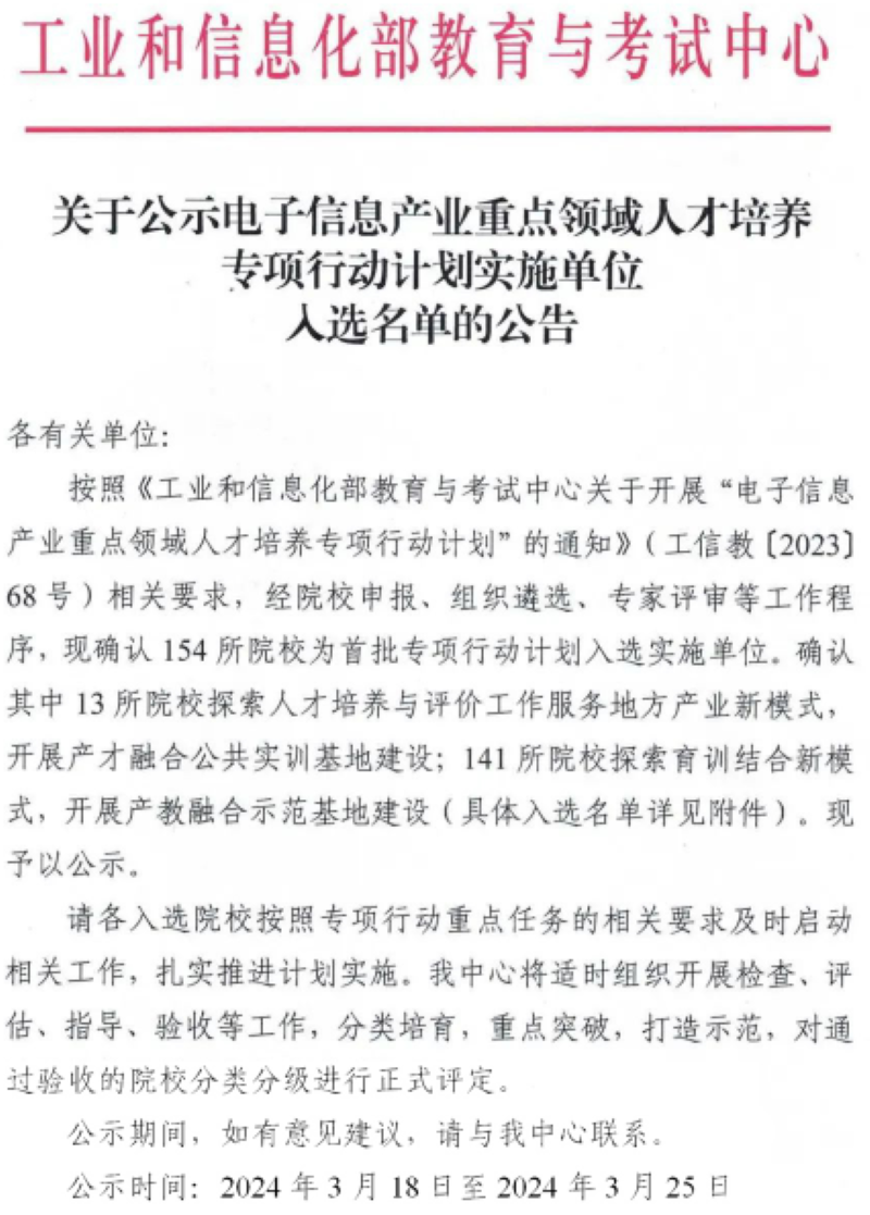 为了提高电子信息产业人才培养质量,推动重点领域产业发展,2023年12月,工业和信息化部教育与考试中心发布了“电子信息产业重点领域人才培养行动计划”。在学校领导和教务处指导下,计算机科学与技术学院组织专业负责人和骨干教师精心准备,积极申报,经过组织遴选、专家评审和线上答辩,我校与北京科技大学、天津工业大学等141所高校成功入选电子信息产业重点领域人才培养专项行动计划首批实施单位。