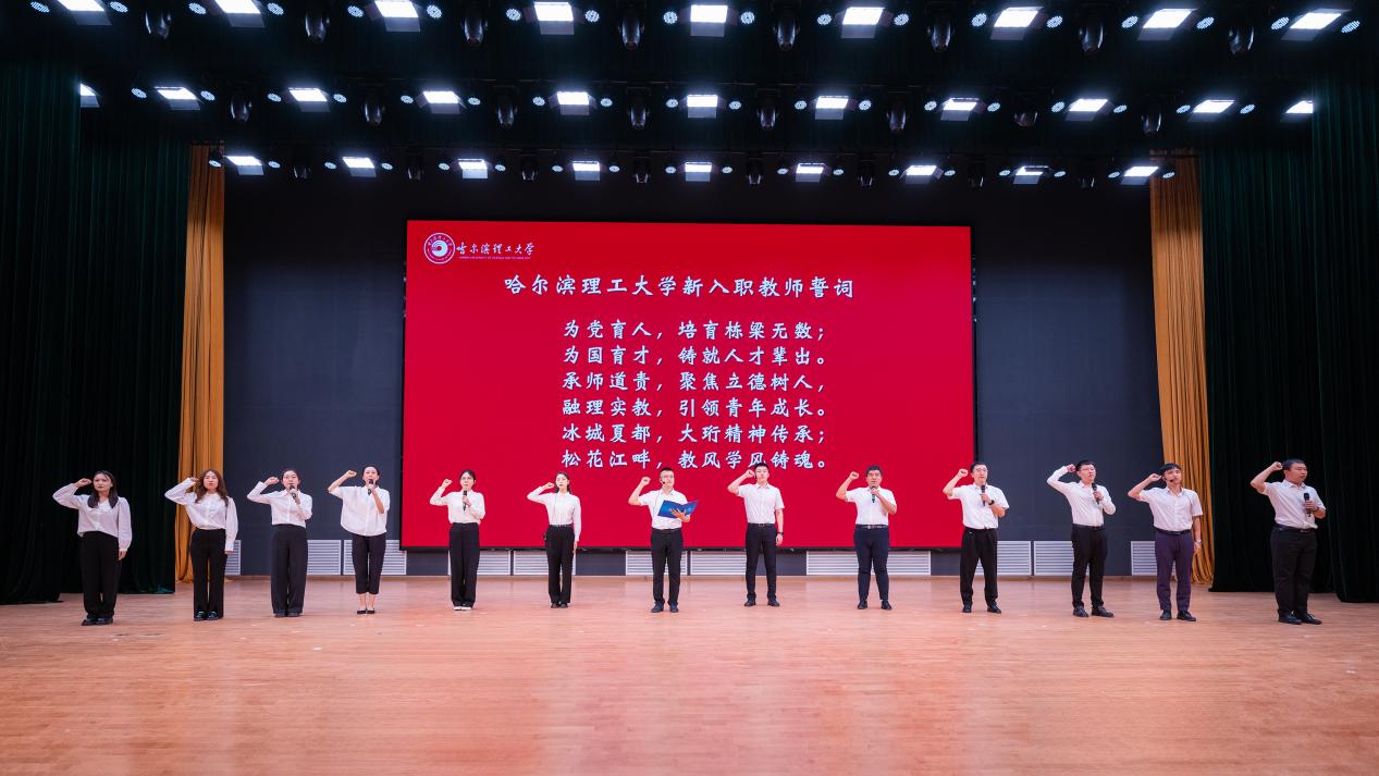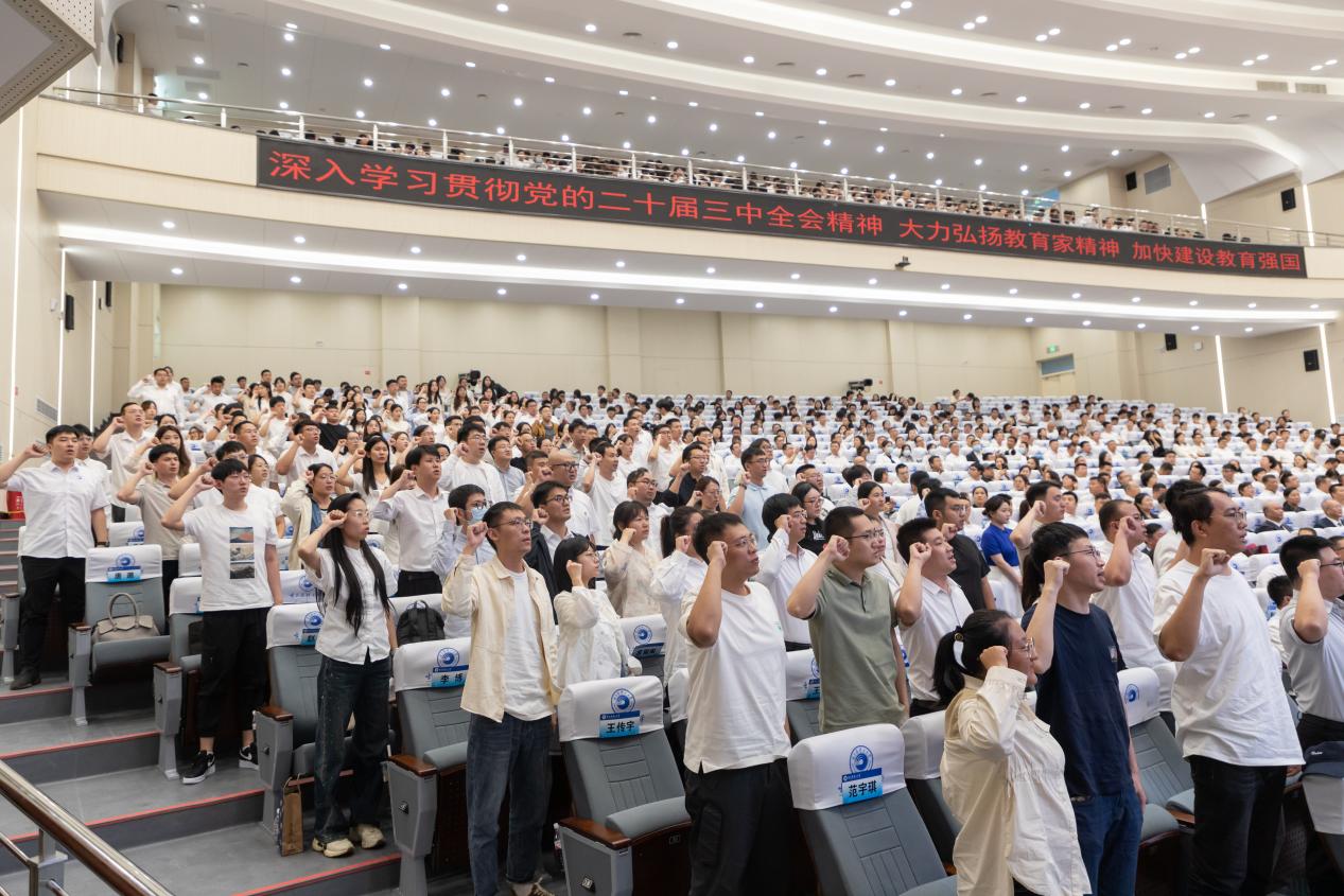 “我志愿成为一名优秀的人民教师,肩负师者重任,为党育人,培育栋梁无数;承师道责,聚焦立德树人,融理实教,引领青年成长……”新入职青年教师们的誓言响彻会场。