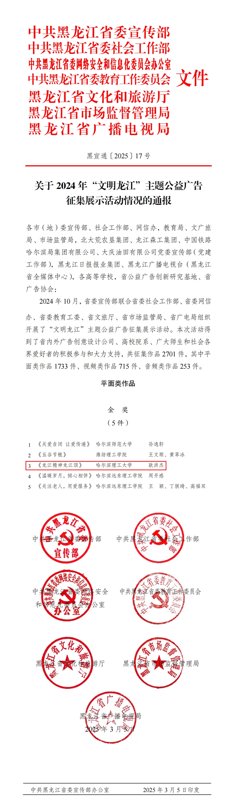 近日,由省委宣传部联合7部门组织开展的2024年“文明龙江”主题公益广告征集展示活动公布评选结果,我校报送的平面类作品《龙江精神龙江颂》凭借出色的创意和独特的设计,在1733件平面作品中脱颖而出,斩获平面类金奖,为学校赢得了荣誉。